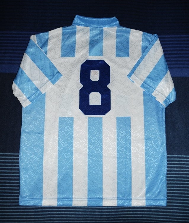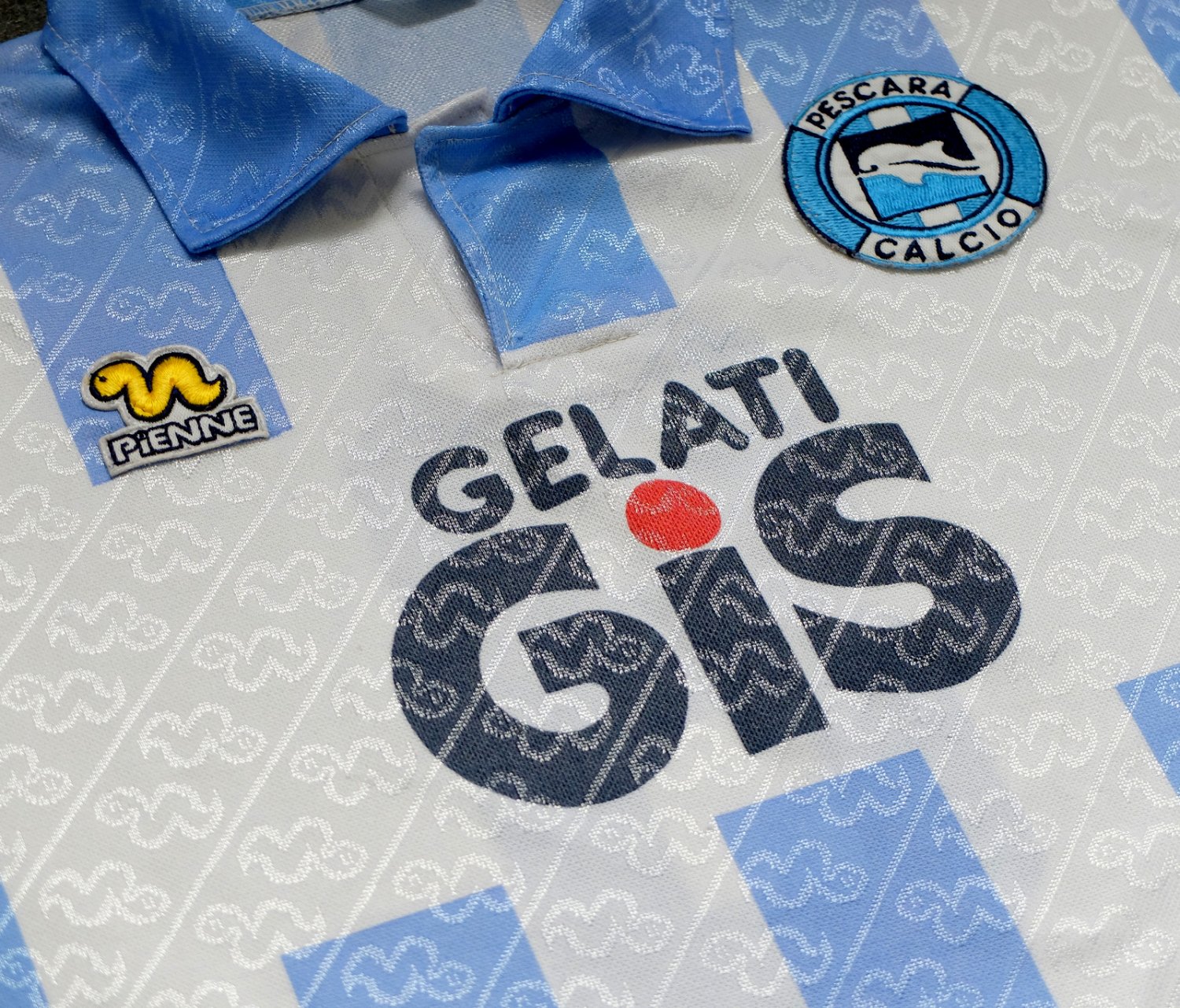 Original Pescara shirt, made by Pienne, sponsored by Gelati GIS. Pescara played in Serie A at the time, although not for long, and wore three different shirts; this tended to be the one they wore at home. The charming Pienne worm/snake logo and club badge are sewn on, while the sponsor is printed, as is the number (8).